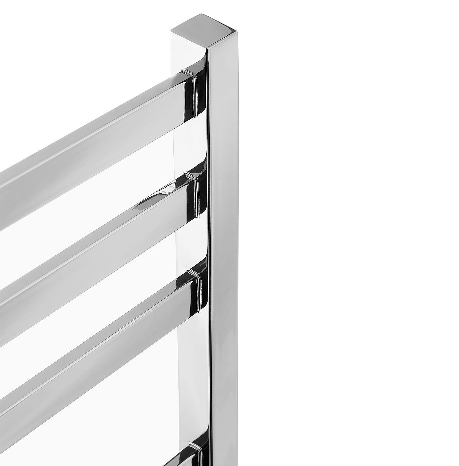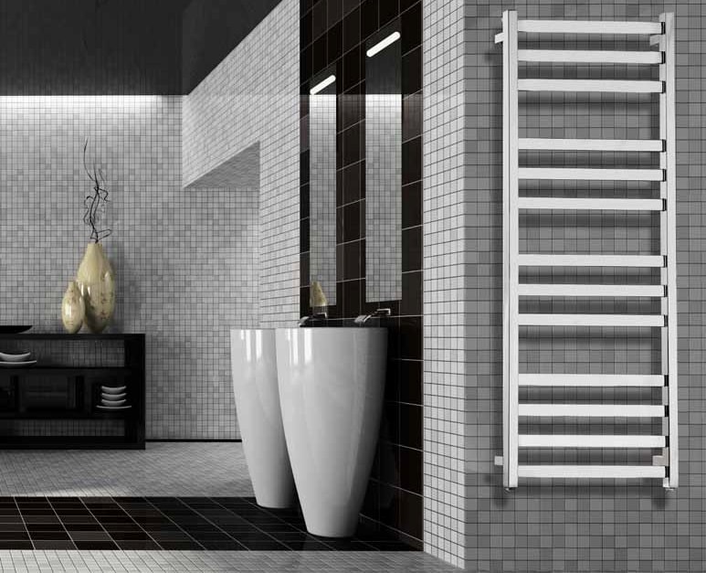 Лаконичная «лесенка» хорошо смотрится в интерьере ванной комнаты. Перекладины с квадратным сечением придают прибору строгий вид. Такой дизайн понравится тем, кто любит простоту, функциональность и чёткие геометрические формы.